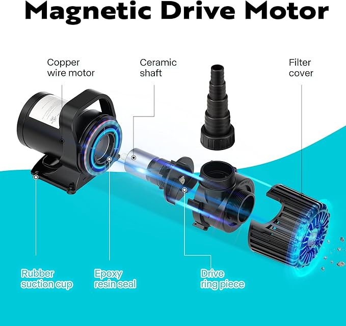 • HIGH LIFT & LARGE FLOW - This pond pump boasts a high-quality copper wire motor and employs advanced magnetic drive motor technology for exceptional performance, energy conservation, and stable operation; With a power rating of 120W, it achieves a maximum lift height of 15ft and a flow rate of 2700 GPH