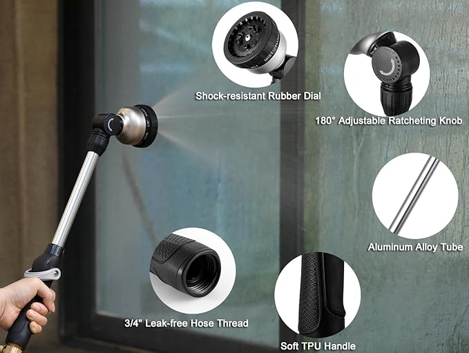 • 【1 YEAR WARRANTY WITH CONFIDENCE】Threaded with the 3/4” Garden Hose Thread (GHT), this garden hose wand fits all standard garden hoses. The watering wand is equipped with washer inside and two additional washers are also provided. We stand by our products through 1 YEAR WARRANTY WITH CONFIDENCE.