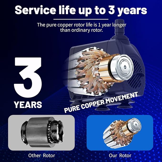 • 【AUTO-SHUT-OFF & SAFE】This pump is AUTO SHUT OFF designed,It's an upgrade of our old version.When your fountain or pond has low water level due to splashing and evaporation,the pump will automatically turn's off,and turn's back on once the water is added.Effectively prevent pump burns out and keep you and your family safe.