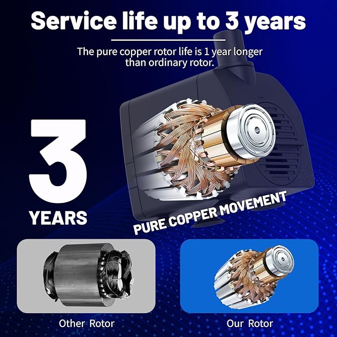 • 【Quality & Ultra Quiet】In order to keep the pump quiet and has a longer service life, increased the cost by using high quality rotor and copper,makes the pump quiet & has longer life than others.