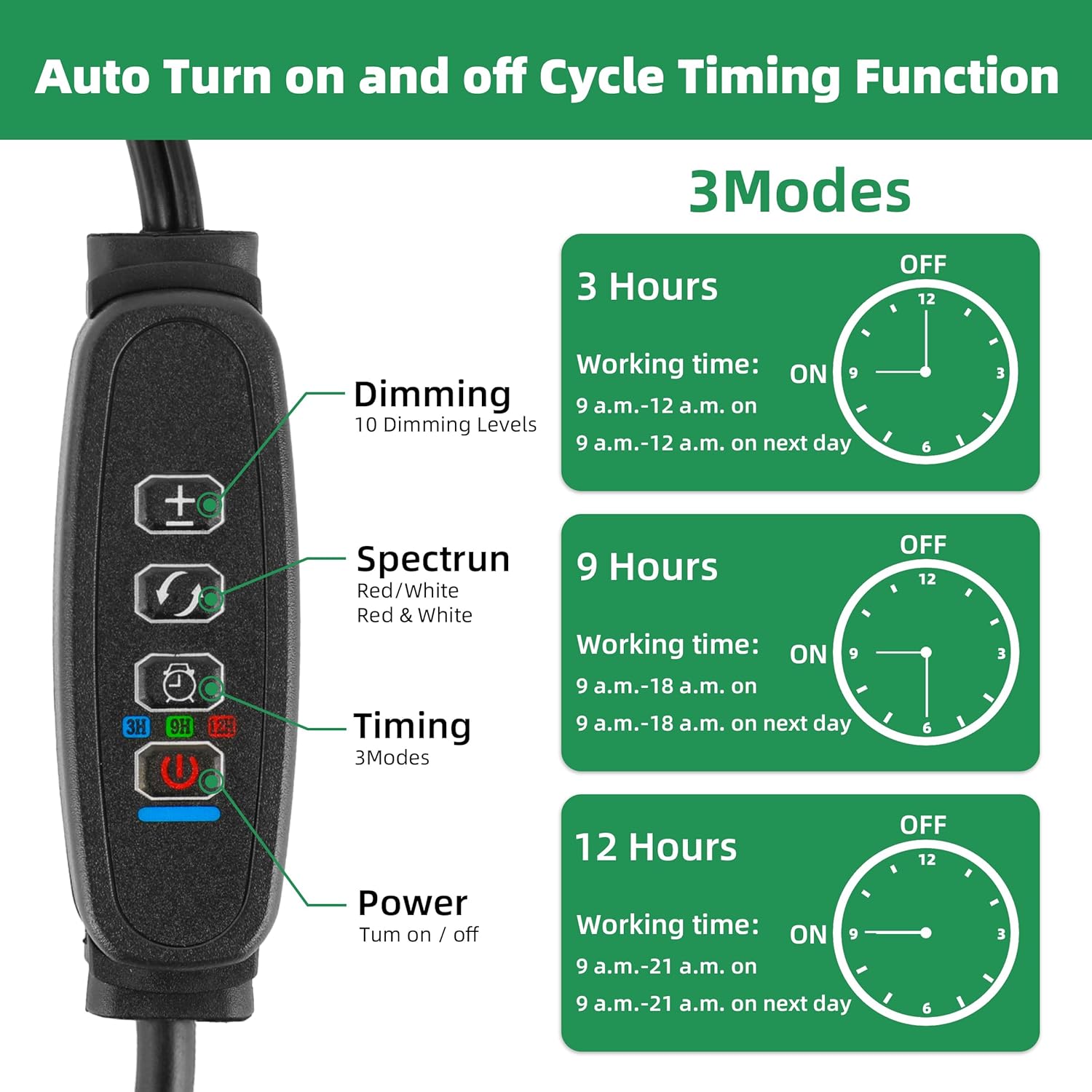 • AUTO ON/OFF TIMER FUNCTION: The plant grow light with automatic cycle memory timing function, can set a timer for 3/9/12 hours, the grow light will automatically at the same time every day turns on and off for 3/9/12 hours under the condition of continuous power supply, you will no longer have to worry about your plants when you are not at home.