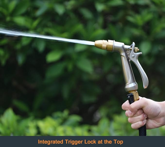 • 【100% HEAVY DUTY METAL CONSTRUCTION】Comes with 100% metal construction built and brass head, durable and powerful. Full soil brass nozzle & High-grade zinc alloy gun body. Gun is much stronger than plastic ones and built to last. The water hose nozzle with internal threads fits all standard garden hoses, One piece design and a rubber hose washer provides a durable and tight seal to eliminate leak.