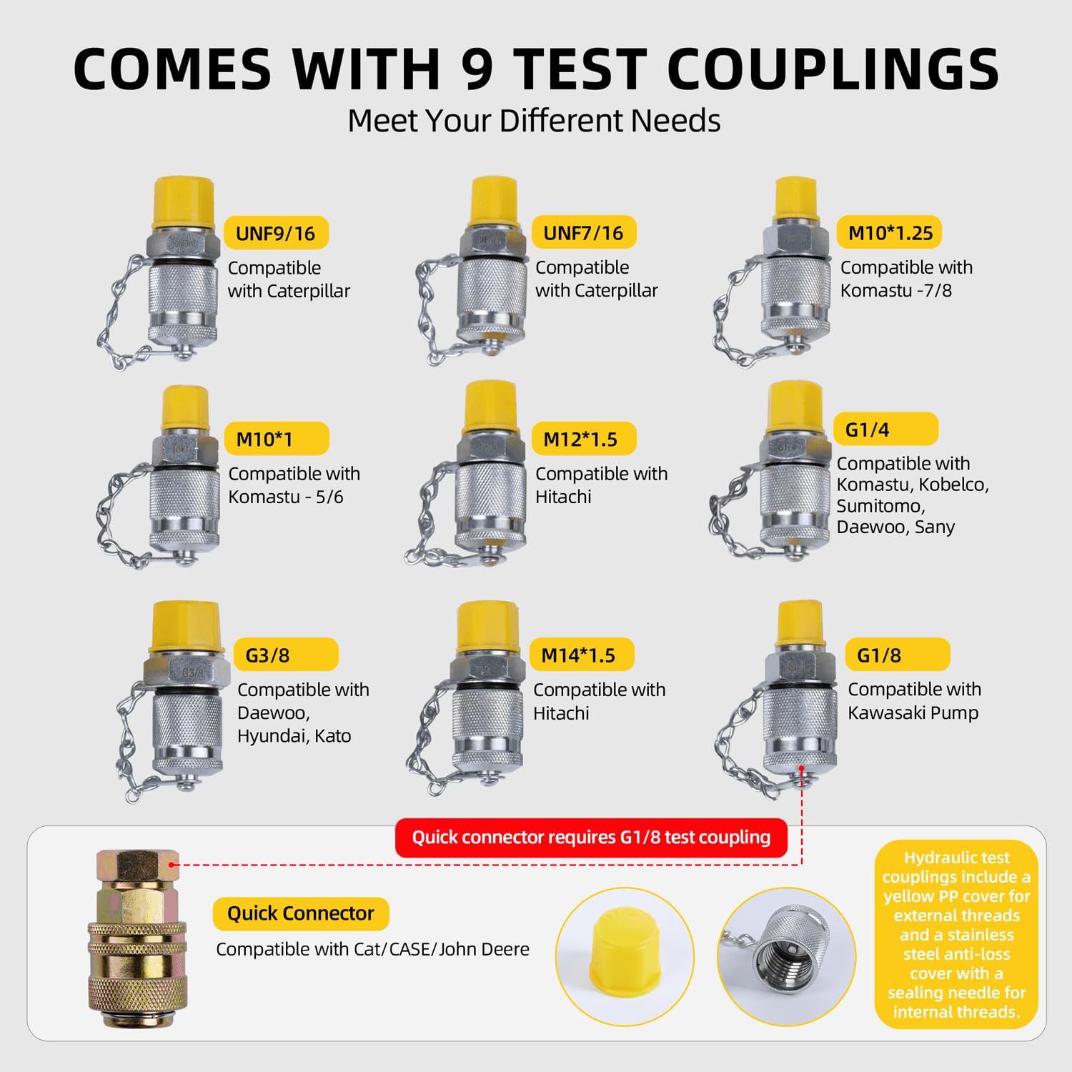 Hydraulic Pressure Test Kit with 4 Gauges (Max 10,000 PSI), 10 Test Couplings, 3 Test Hoses, Hydraulic Gauge Tester Set for Excavators, Construction Machinery, and Mining.
