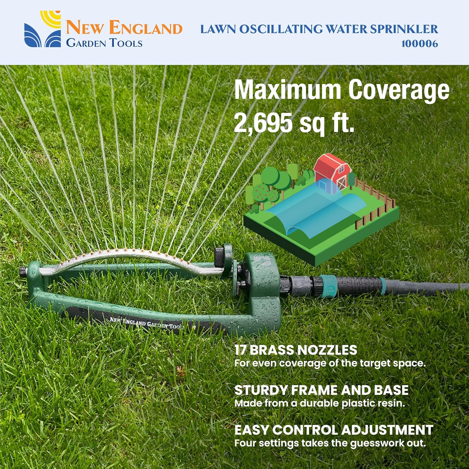 Lawn Oscillating Water Sprinkler 100006 Adjustable Pattern to Cover 2,695 sq.ft. by New England Garden Tools