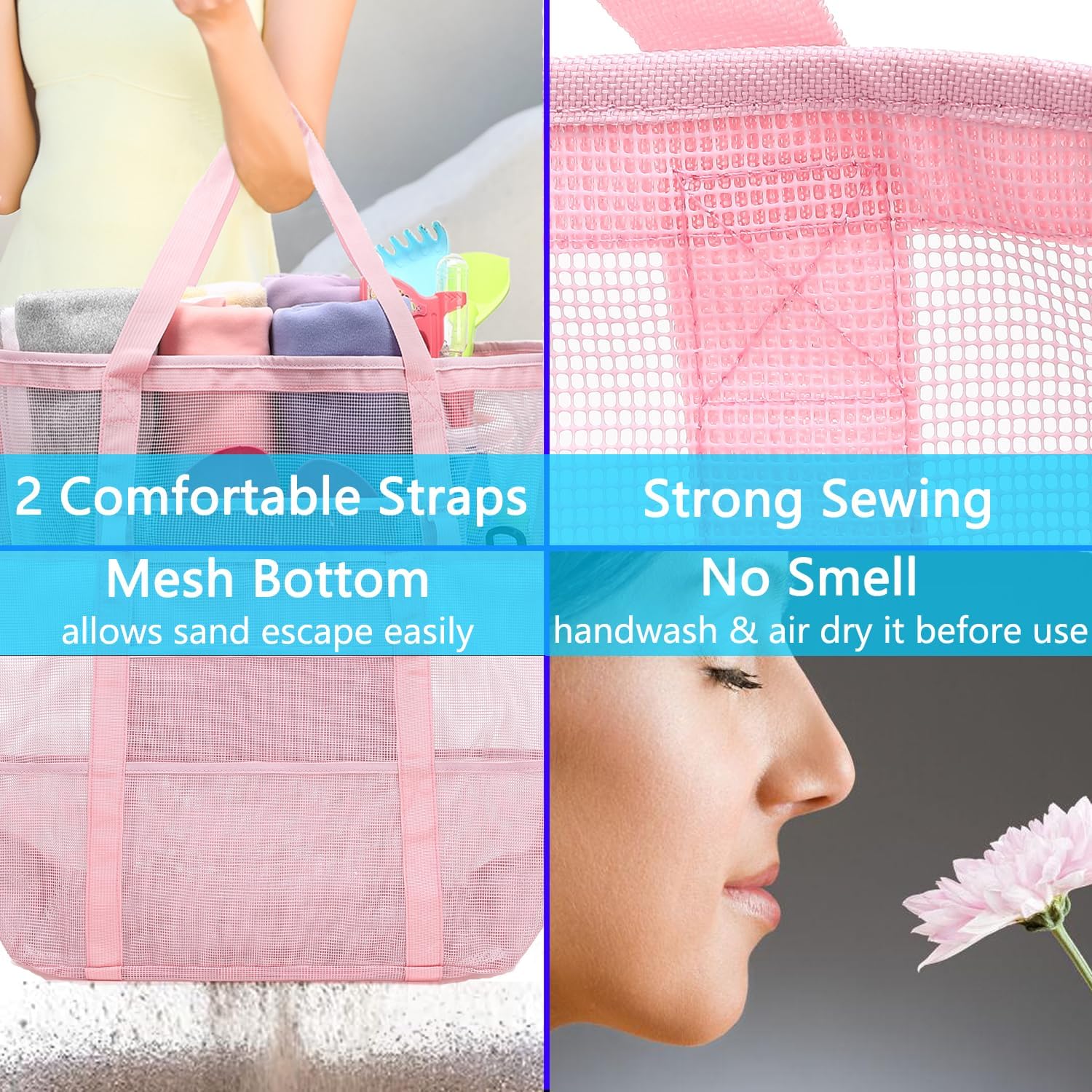 • ๐Ÿ–๏ธใ€๐ƒ๐ฎ๐ซ๐š๐›๐ฅ๐ž & ๐๐จ๐ซ๐ญ๐š๐›๐ฅ๐žใ€‘This mesh towel bag is constructed from sturdy 600D polyester and tear-resistant mesh materials, and the reinforced stitching further ensures exceptional durability, allowing it to withstand loads of up to 160 lbs. This beach must haves is lightweight, collapsible and easy to carry. The 9-inch long shoulder strap of this beach tote for women adds a significant comfort factor to its transportation.