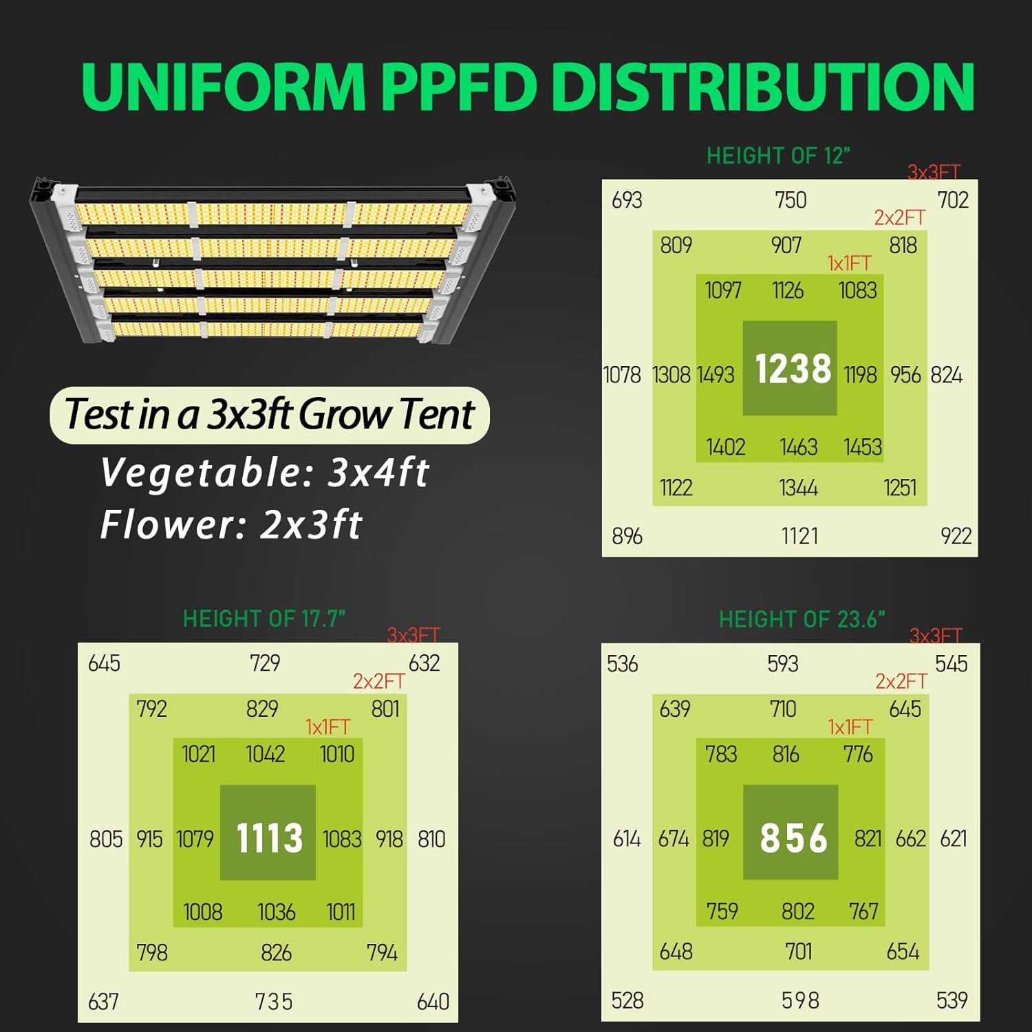 • High Efficiency & High Yeild: 750pcs samsung LM301H EVO and LM281B+Pro LEDs, market-leading 2.7 µmol/J PPE, Max yield 2.5 g/W, achieving an impressive PPFD 1238 μmol/m²/s at 3x4ft core coverage. Compared with other similar lamps, the yield is increased by 20%, the average PPFD is increased by 20%, and the energy consumption is reduced by 10%
