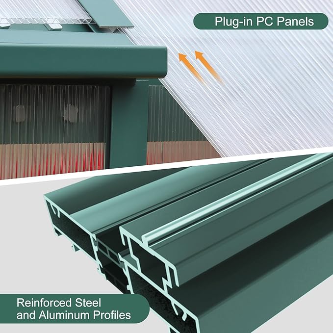 • Durable Panels: These 4mm twin-wall polycarbonate panels are nearly unbreakable. They allow 70% light transmission for optimal plant growth while blocking over 99.9% of harmful UV rays. Perfectly sized for your backyard, terrace, or garden, this greenhouse is great for casual gardeners and flower enthusiasts, providing ample space for plant preparation and growth.