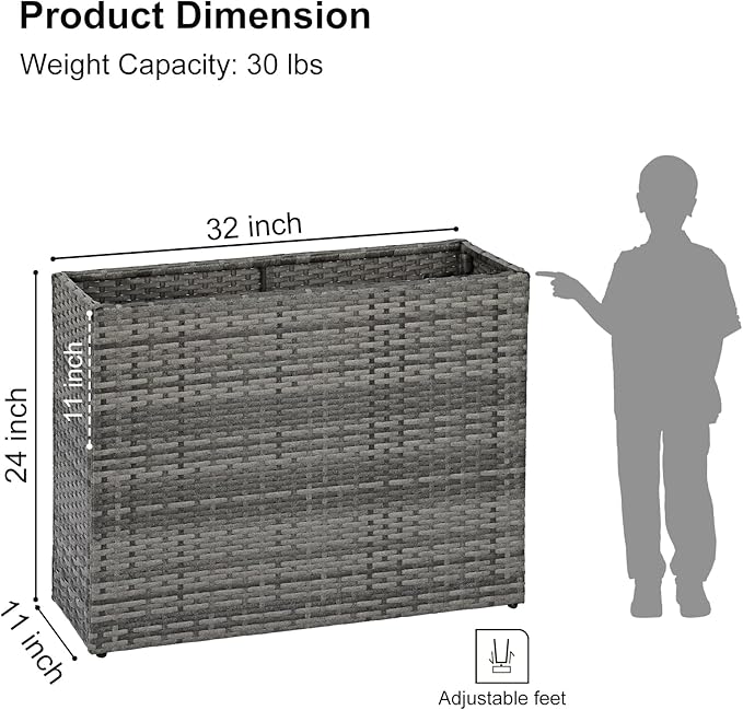 • Product Details - Dimensions (LxWxH) Plant pot: 32 x 11 x 24 inch Material: PE rattan, Powder-coated Steel, Plastic , Adjustable Feet
