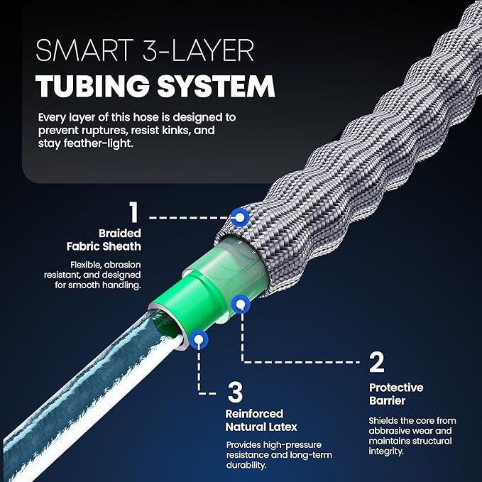 • [Universally Compatible Kink-Free Design] Engineered with standard 3/4" GHT, corrosion free, pure brass connectors, our hose fits a wide array of faucets nozzles and accessories. The ultra flexible, never kinking design contributes to a hassle-free watering experience. The triple layer construction provides a durable and manageable garden hose with dependable performance in various weather conditions.