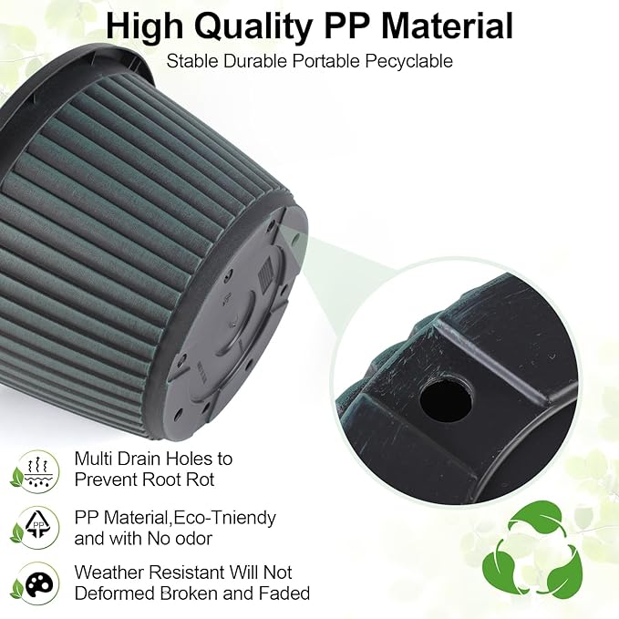• 【Perfect Size & sturdy Material】Top diameter: 10 inch, bottom diameter: 6.54 inch, height: 6.4 inch, capacity: 1.34 gallon. Plastic plant pots are made of recyclable polypropylene resin which is lightweight but sturdy, not easy crack. These indoor outdoor planters are UV and weather resistant. 10 inch flower pot is perfect for planting medium to large sized plants.