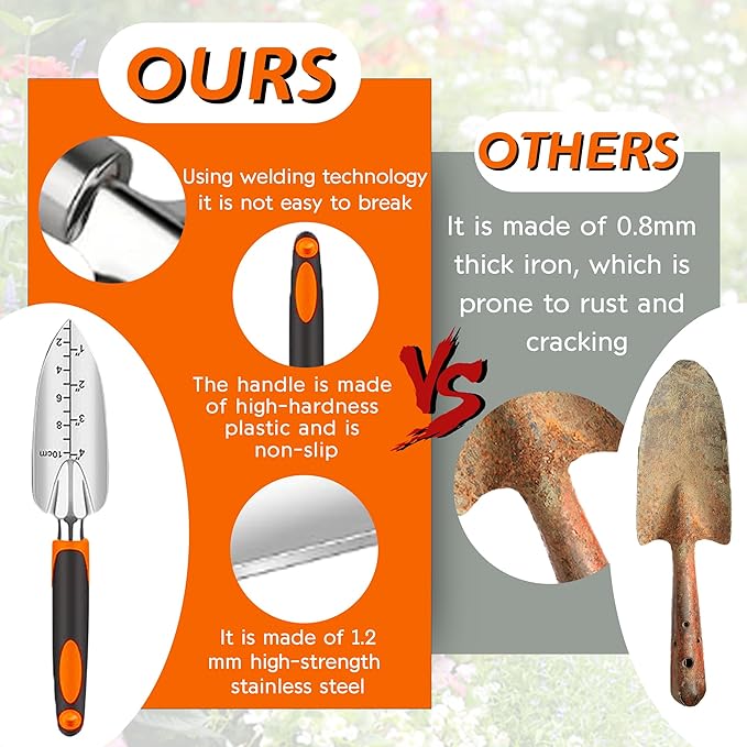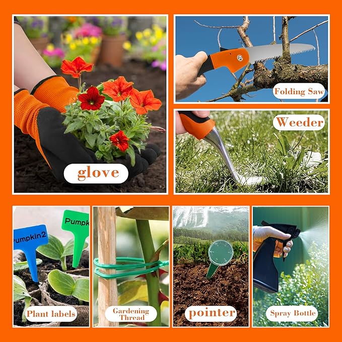 • Ergonomic Handle: After continuous testing by garden engineers, we combined our experience to design this more comfortable and labor-saving anti-slip TRP handle. Whether for children or seniors, the ergonomic design makes digging, carrying, weeding, planting, and pruning easier with these gardening hand tools, reducing hand pain and fatigue, their intuitive design provides Plenty of leverage. And we are equipped with gardening gloves, which can protect your hands very well.