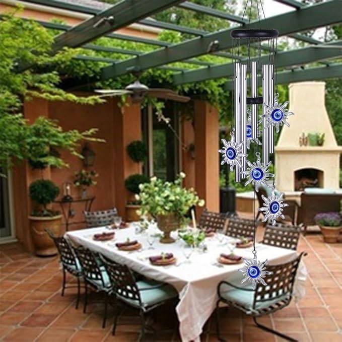 • UNIQUE DESIGN: Blue evil eye sun wind chimes, pure hand-made with 5 silver premium aluminum tubes. 6 symbolizing good fortune sun blue evil eyes. 1 strong beech wood. From the hanging ring to the bottom hanger, whole wind chimes measures 28 inches. Each metal tube has its own unique tone when it collides. Enjoy the wonderful music to soothe your body and mind. Enjoy peaceful melodies it plays. The sound is soft, clear and relaxing.