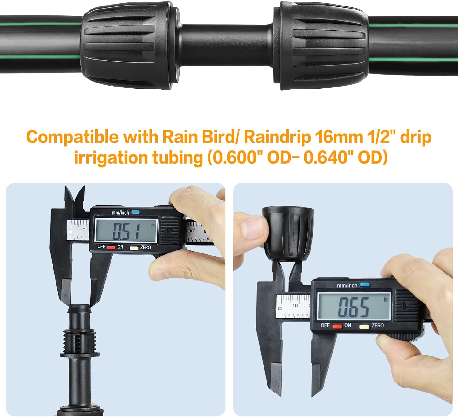 • 【Fits 1/2 Inch Drip Irrigation Tubing】:These 1/2 drip line irrigation connectors are compatible with Rain Bird / Raindrip 1/2" drip irrigation tubing (1/2" ID x 0.640" OD).