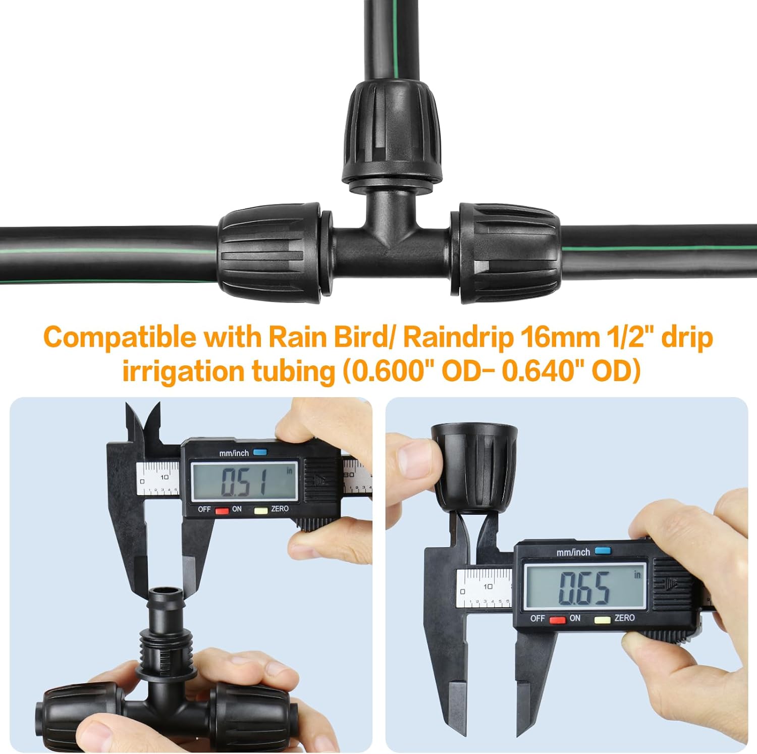 • 【Fits 1/2 Inch Drip Irrigation Tubing】:These 1/2 drip line tee connectors are compatible with Rain Bird / Raindrip 1/2" drip irrigation tubing (1/2" ID x 0.640" OD).