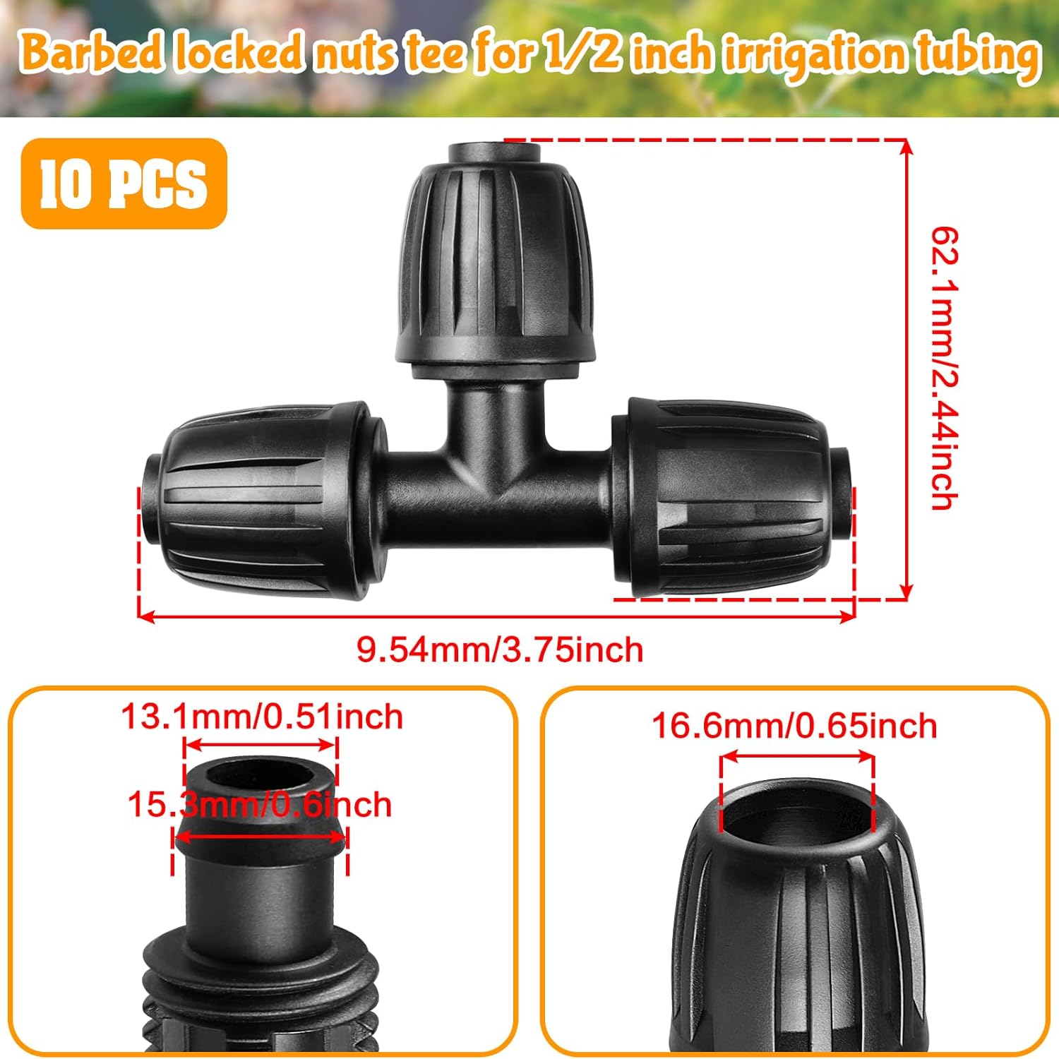 Drip Irrigation Fittings for 1/2 Inch Drip Tubing (1/2" ID x 0.65" OD):1/2'' Drip Line Tees Anti-drop Locked Nut Barbed Tee Connectors Garden Irrigation System Parts (10 Pack)