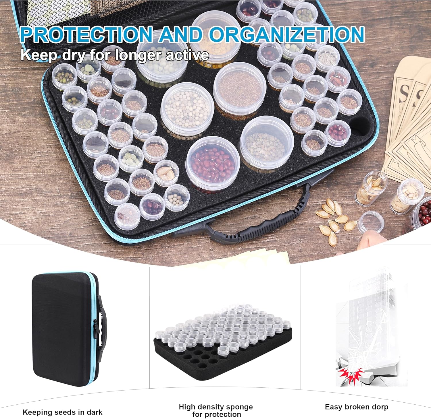 • COMPACT AND ORGANIZED: The interior of the carrying case features a spongy material, securely holding each plastic seed jar in individual compartments to prevent damage. The secure zipper closure allows easy access to your seeds while shielding them from damaging sunlight, maintaining an organized and protected seed collection.