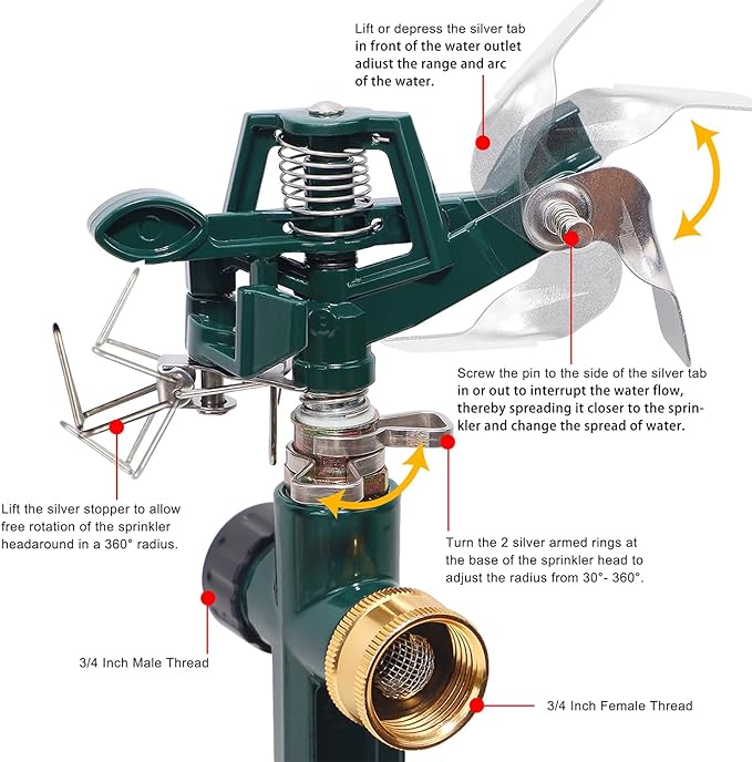 • METAL IMPACT SPRINKLER WITH SPIKE: Heavy duty lawn impact sprinkler head with step spike for yard, lawn and grass Irrigation. The lawn sprinkler can be adjusted from full circles of 360 degrees to partial circle patterns that turn 20 degrees to 340 degrees. Adjust the spray range and radian of water to make the irrigation in the garden fun