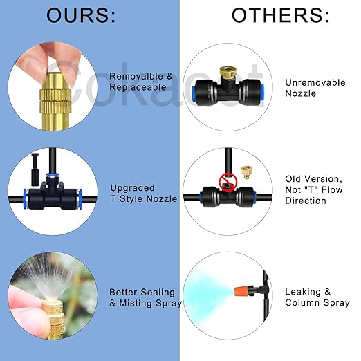 • Upgraded Misting Irrigation System - Cokacot 49.21Ft 8mm drip irrigation tubing system kit with upgraded brass misting nozzles and T-joints has better performance in anti-leaking and connection, the irrigation kit also comes with upgraded 1/2 inch and 3/4 inch faucet adapter with filter net for blocking impurities.