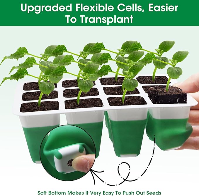 - 【Flexible Cells】-- Our seed starter tray with 60 flexible pop-out cells make plant transplant easier. Gently press the silicone cells upward and the seedlings will pop out without damage to the roots.Easy to clean and reuse.