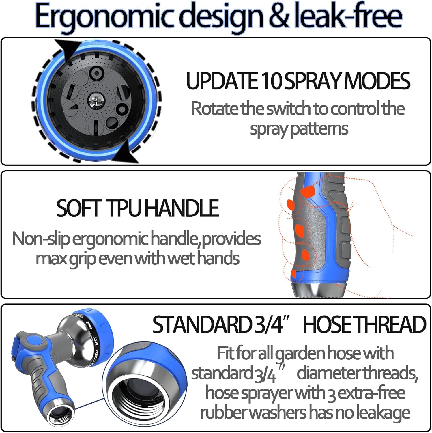 • 【FITS all Standard Garden Hoses】This hose sprayer nozzle has clear threads, comes with 3 leak proof gaskets and is compatible with standard garden hoses, which can be connected to all 3/4 '' joints, making installation easier and more convenient.