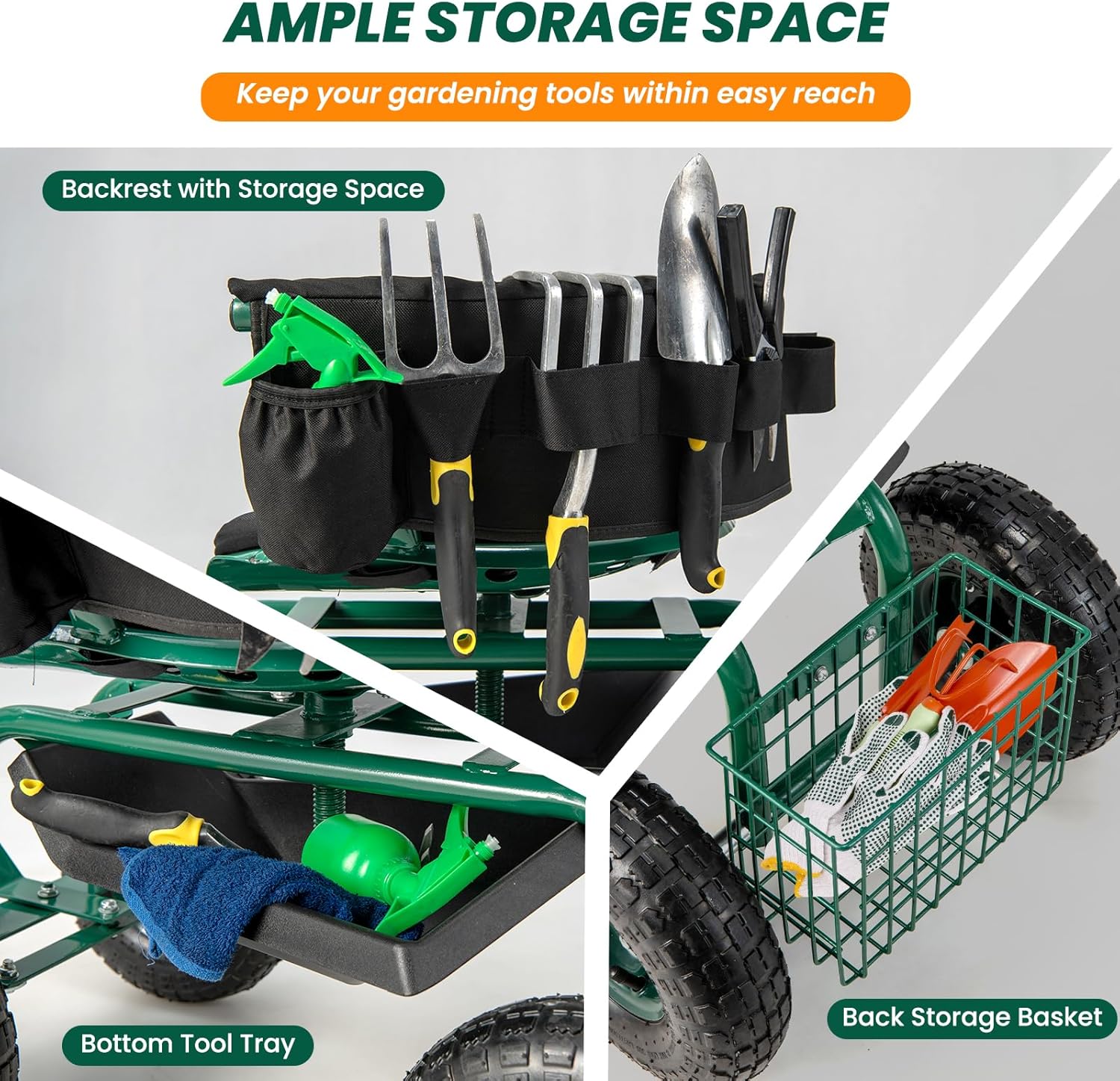 • ๐ŸŒนErgonomic Seat with Comfortable Cushion: This garden cart comes with a cushion for extra comfort, and the cushion is removable for easy cleaning. In addition, the height of the garden work seat can be adjusted between 16.5โ€™โ€™ and 20.5โ€™โ€™, and can be turned 360ยฐ, so that gardening can be easily done while sitting.