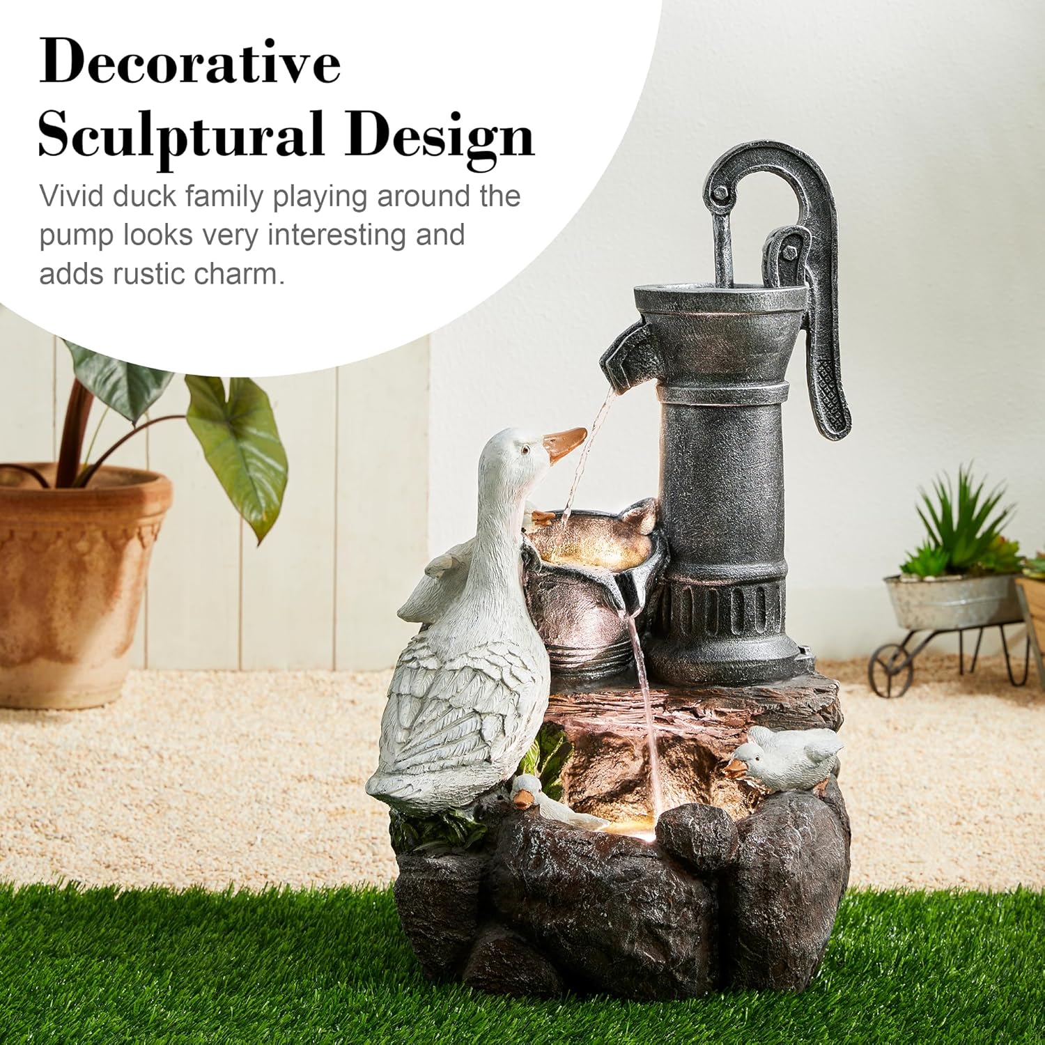• Durable & Stylish Polyresin Outdoor Fountain --- This durable, weather-resistant duck water fountain. Made from a sturdy blend of polyresin and stone powder, it’s built to withstand harsh outdoor conditions while maintaining its beauty season after season. The lifelike stone texture and gentle water flow create a calming atmosphere while complementing any outdoor decor.