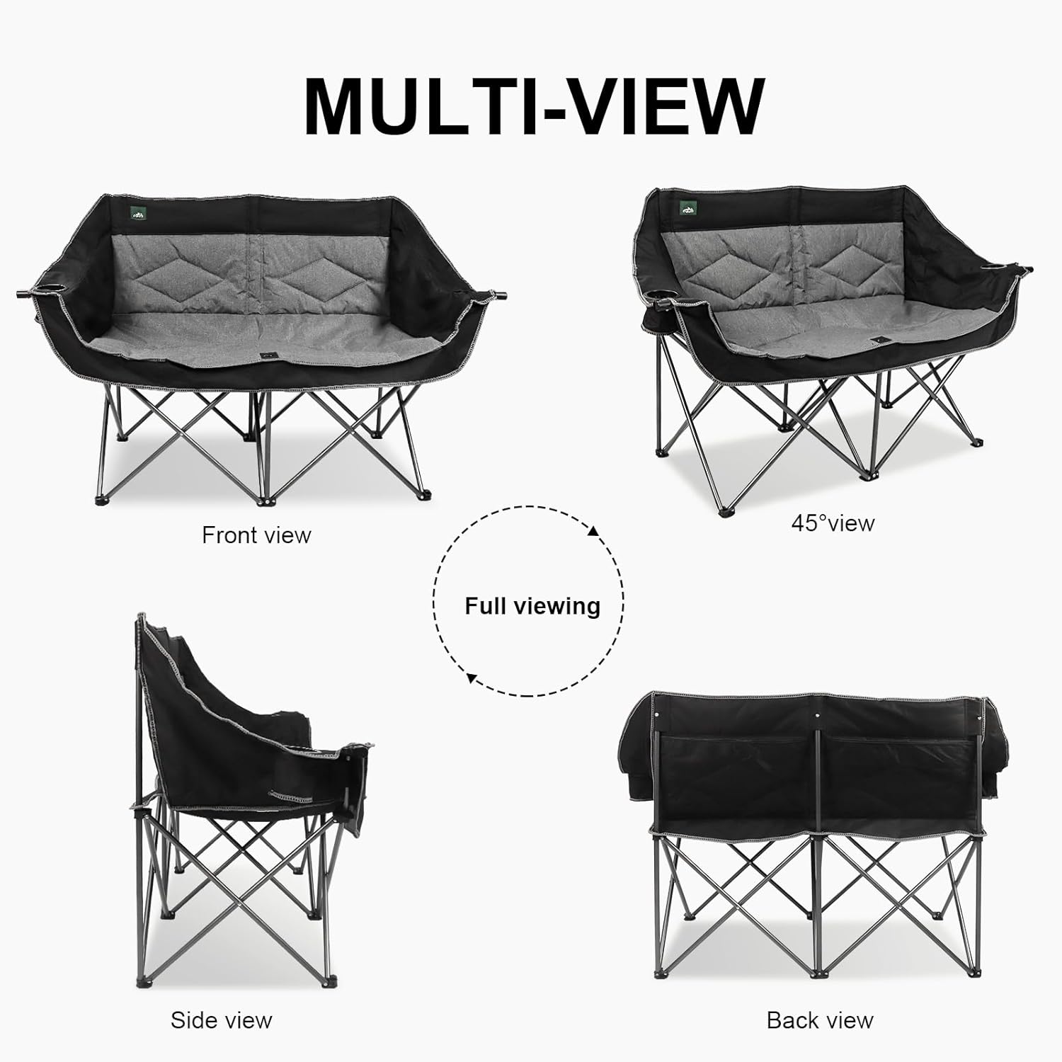 Northroad Folding Loveseat Camping Chair Portable Double Duo Full Padded Garden Sofa Chair for 2 Person w/ 2 Cup Holder,Wine Glass Holder,Support 600lbs for Outdoor Travel (Black)