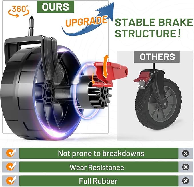 • All-TERRAIN WHEELS W/ BRAKES: 7.5"x3.4" big wheels with 360° rotating front wheels and built-in brakes. Ideal for camping, shopping, or gardening without causing fatigue.