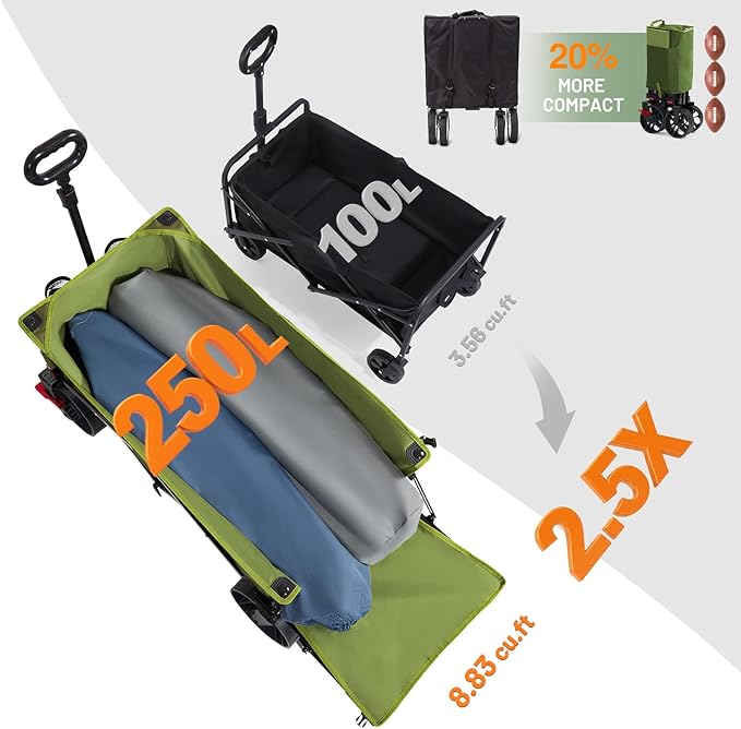 • LONGER & SPACIOUS: This collapsible wagon features a foldable tailgate, perfect for a 10x10ft pop-up canopy. It offers a storage capacity of up to 250L (8.83 cu.ft), 50% more than other wagons. Plus, it’s pet-friendly, allowing dogs to get in and out easily