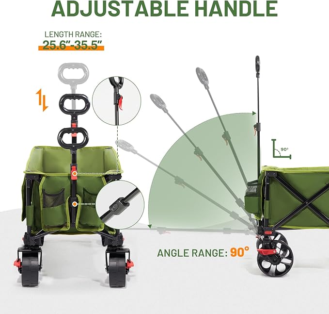 • AMPLE STORAGE: The heavy duty wagon includes 2 cup holders and oversized side pockets for convenient storage; the utility cart handle can be adjusted from 25.6" to 35.5" to accommodate different heights, ensuring a comfortable experience