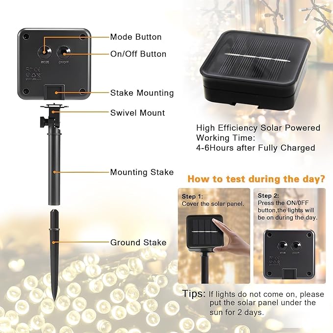 • 【8 Modes & Memorized Light Sensor】Press the mode switch, there are 8 different modes which can be adjusted by the "Mode" button on the back of the solar panel. The outdoor solar light strings also have a memory function that remembers the last set of modes. They utilize light sensing technology, which means they can turn on automatically at night. Now you don't have to reset them every day!