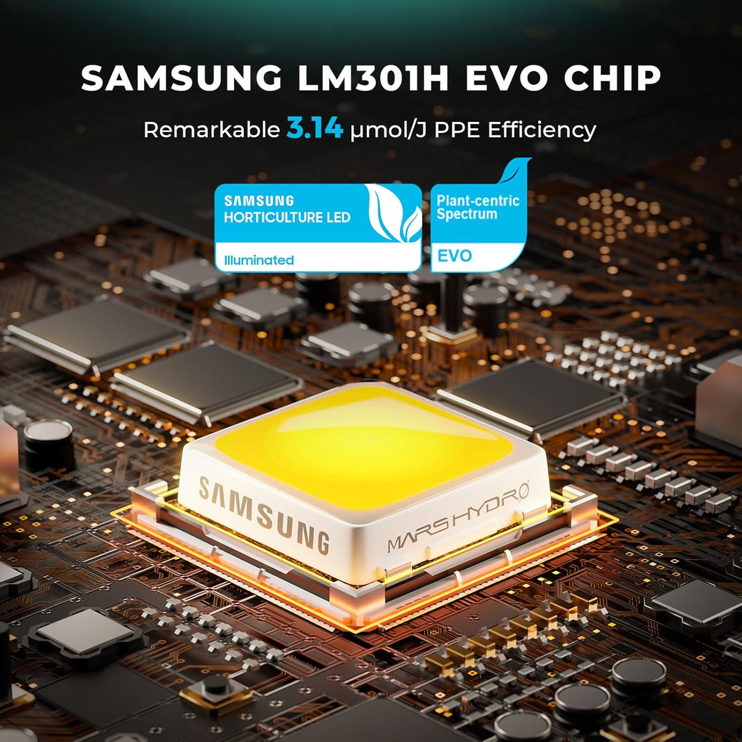 • 【150W HIGH YIELD SMART DIMMABLE GROW LIGHT】Packed with cutting-edge Samsung LM301H EVO diodes, delivering a remarkable 3.14 μmol/j per diode and provides an overall PPE of 2.85 μmol/j, a PPFD of up to 420 μmol/m²/s, making it an excellent choice for enhancing flowering to produce higher quality crops and greater yields.Sunlike full spectrum,0 to 100% light brightness adjustment,convenient for energy saving,suitable for all stages of plant growth.