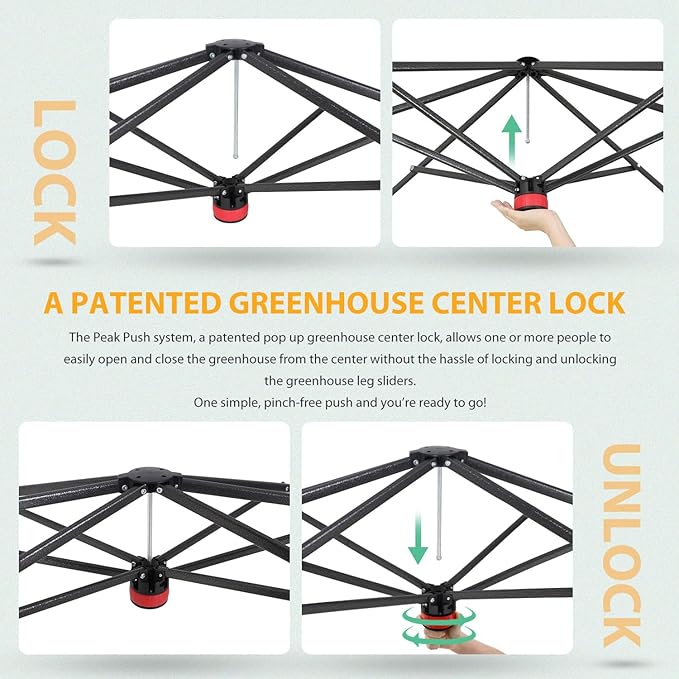 • EASY SETUP: This easy setup pop up greenhouse plant tent features the Peak Push system, a patented greenhouse center lock. The portable greenhouse requires no tools and easily opens and closes from the center in seconds. Its unique greenhouse center lock enables a quick, one person setup, letting you maximize gardening with minimal effort