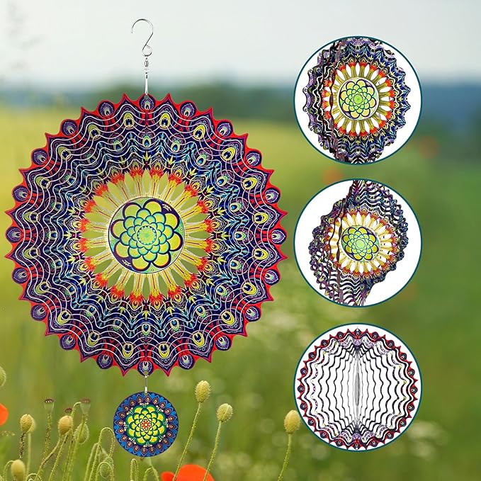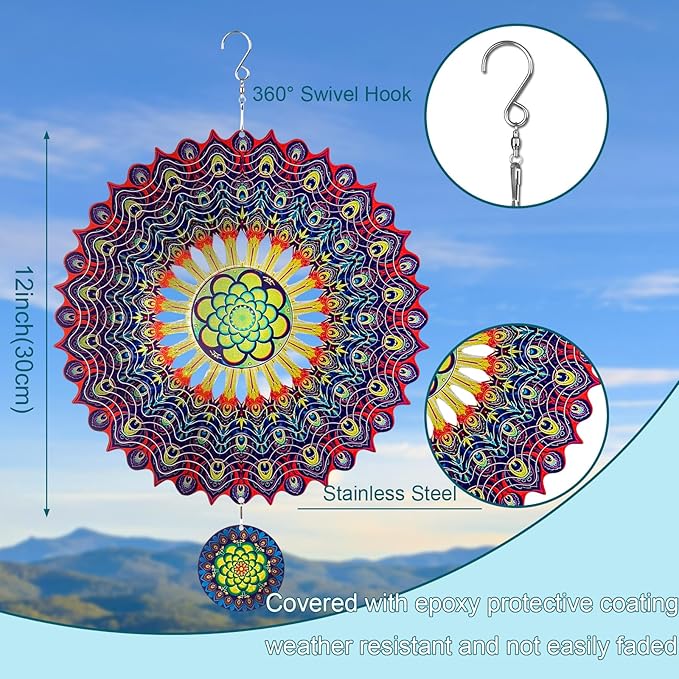 • PERFECT SIZE AND 360° ROTATING: Measuring 12"W x 12"H.Our portable art wind spinners easy to unfold, twist and hang,The convenient metal S-shaped swivel hook will help us experience the mesmerizing beauty of our wind spinners as they gracefully rotate 360 degrees with the slightest breeze. This gentle motion creates a captivating display, adding a sense of tranquility and relaxation to your outdoor or indoor space.