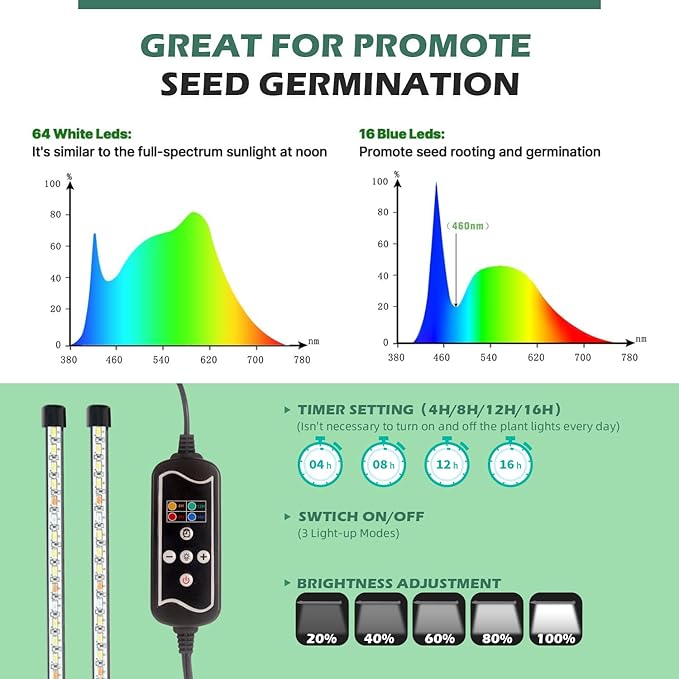 • Embedded Led Lamps:Each plant light is equipped with 4 blue and 16 white lamp beads, meticulously engineered to replicate natural sunlight. The blue light is tailored to boost the vigor of seedling root systems, leading to increased survival rates and the development of stronger, healthier seedlings. Experience seamless adjustment of light brightness and strip light settings, empowering you to cultivate microgreens, herbs, vegetables, fruits, and beyond with precision.