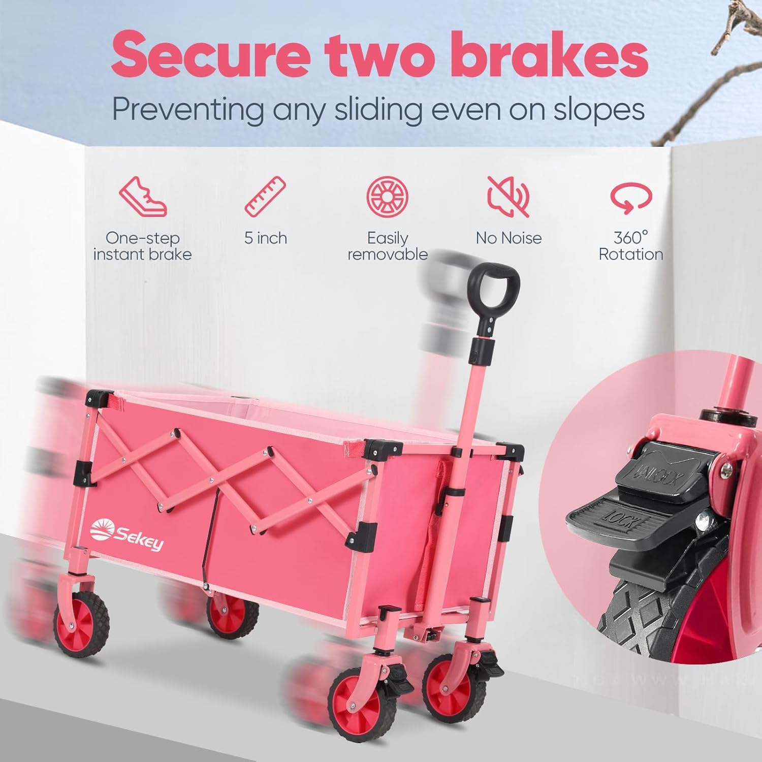 Wagon with Brakes, Foldable Cart with 220LBS Capacity, Utility Lightweight Wagon, Collapsible Grocery Shopping Cart for Camping Sports & Holiday.Pink