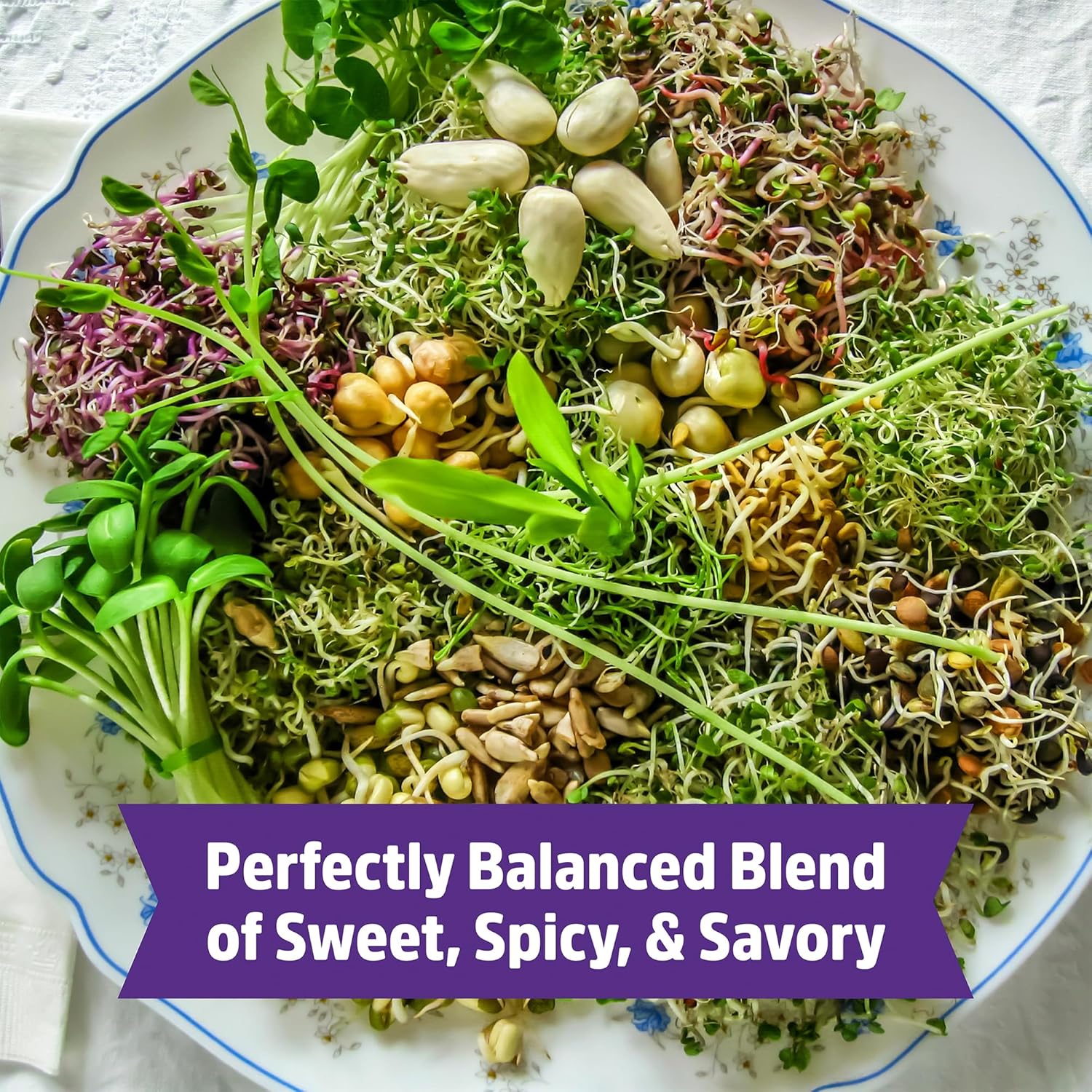 • PERFECT BLEND OF SWEET, SPICY AND SAVOR: Our blend offers a harmonious combination of mild, earthy notes from alfalfa, a subtle peppery kick from radish, mung introduces sweetness, and a hint of freshness from broccoli, creating a delightful medley that enhances the taste of your dishes with a satisfying crunch.
