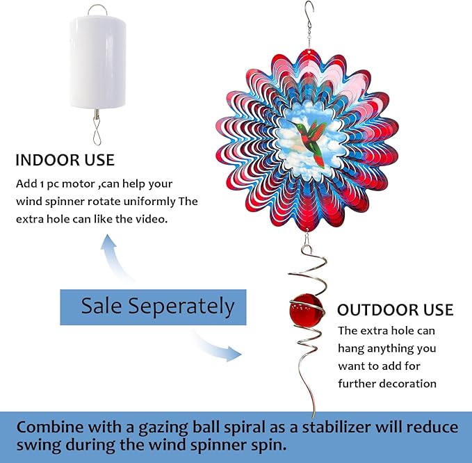 • 【 Animated Hummingbird Wind Spinner 】The innovatively designed 3D Hummingbird Animated Wind Spinner is a mesmerizing marvel. This hummingbird wind spinner spins with the breeze, creating a kaleidoscope of colours and a 3D holographic effect, making it look like a beautiful flying hummingbird.