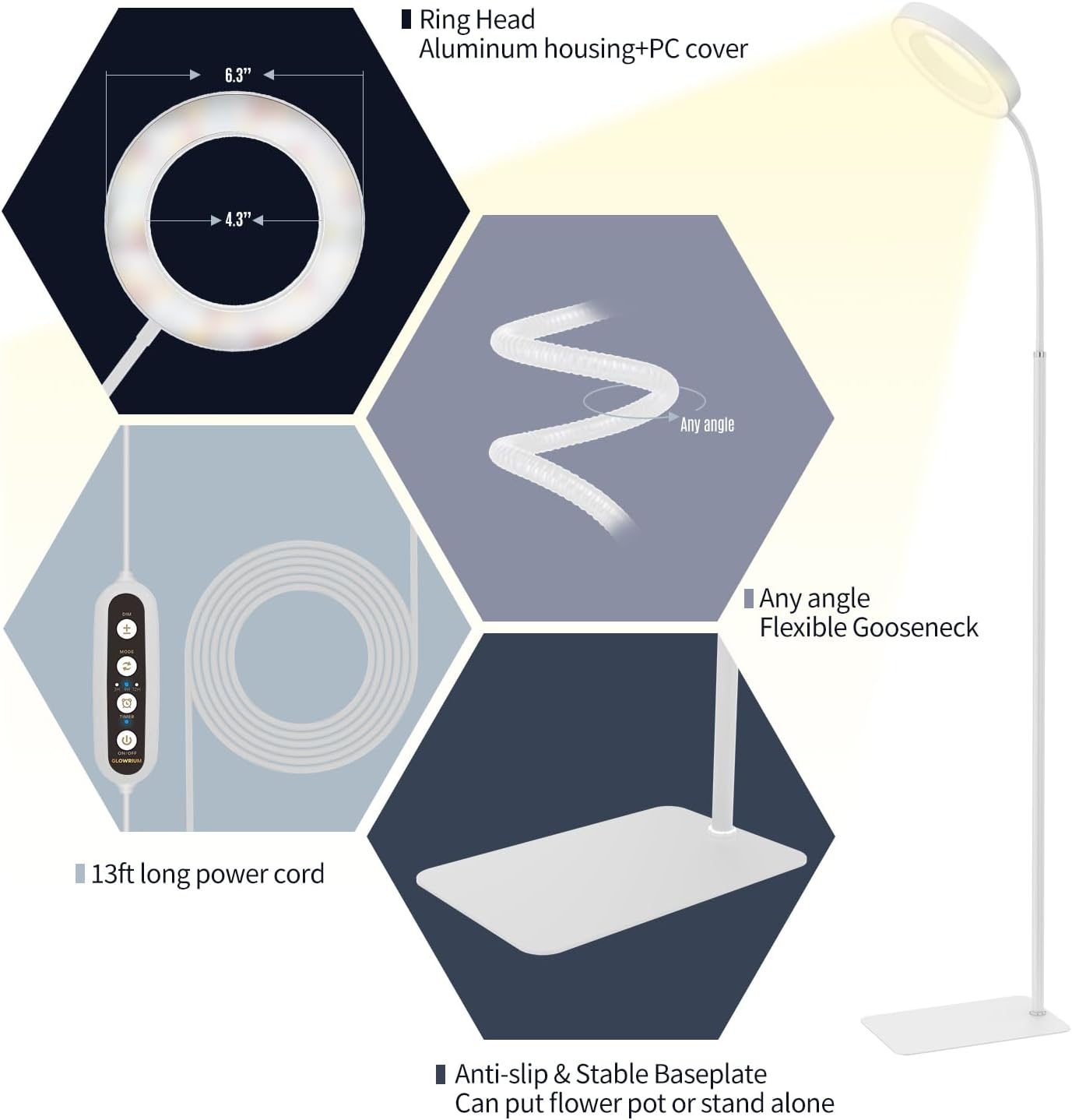 GLOWRIUM Grow Lights for Indoor Plants,20W Full Spectrum LED Plant Light with Stand,Adjustable Height,3/9/12H Timer,6 Dimmable Levels & 3 Lighting Modes (White-Single Head)
