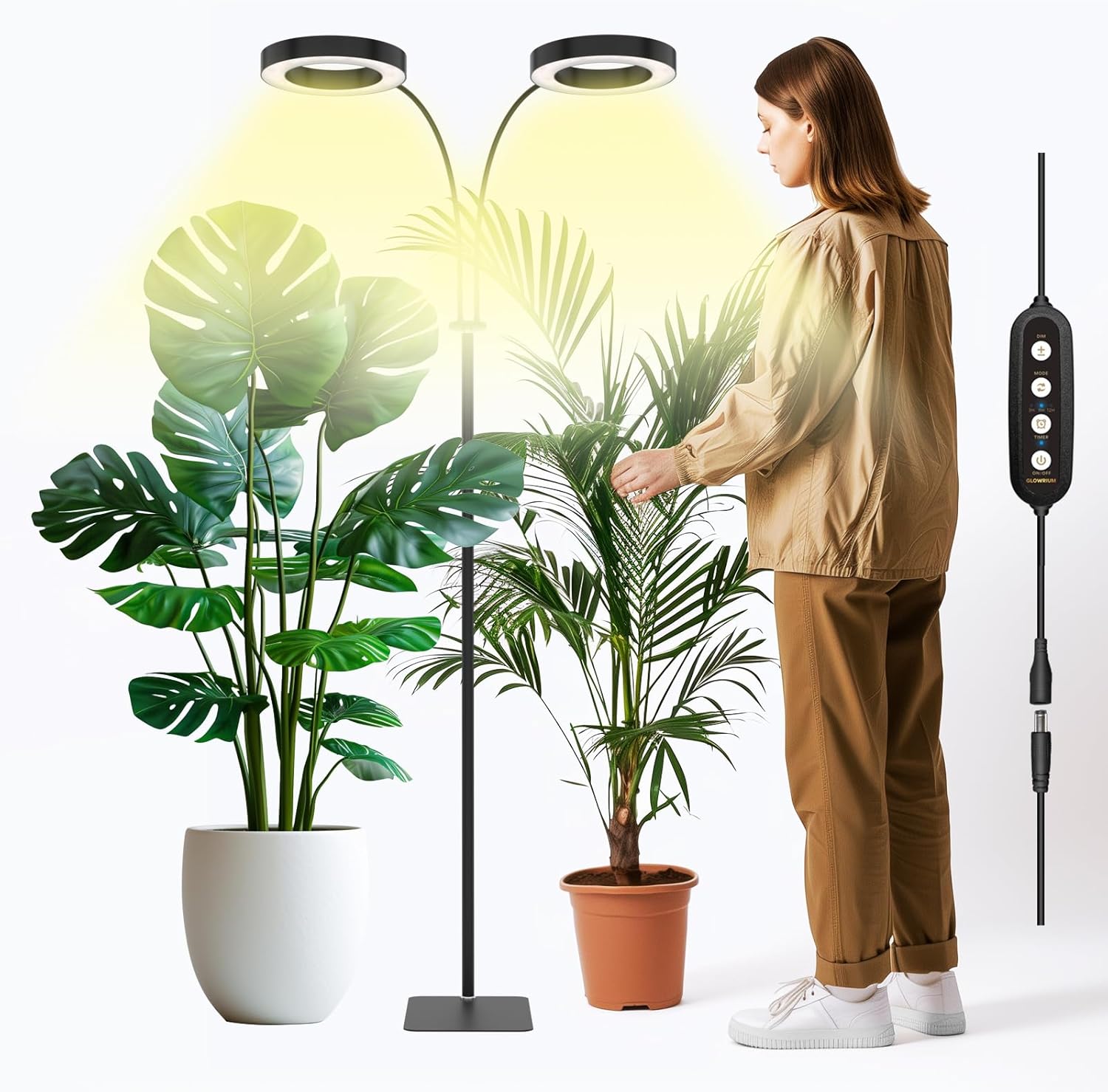 GLOWRIUM Grow Lights for Indoor Plants, 36W Full Spectrum 2-Head LED Plant Light with Stand, Adjustable Height, 3/9/12H Timer, 6 Dimmable Levels & 3 Lighting Modes(Black-Double Head)