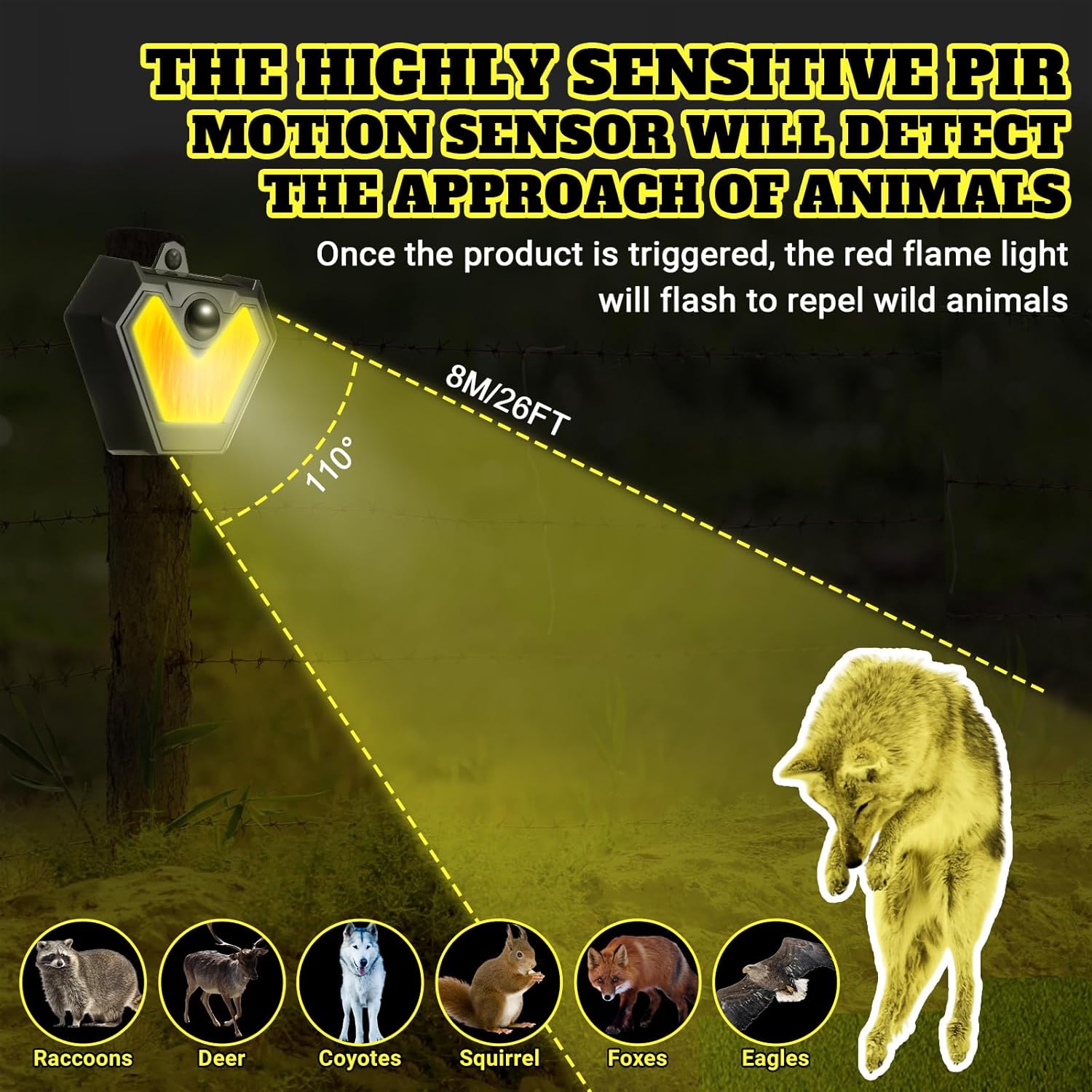 • Wide Application: the coyote deterrent can be placed to any outdoor space to protect your yards, chicken coops, farms, garden and vegetable fields from nocturnal animals attack like raccoons, deer, coyotes, fox, skunks, birds, gophers, mice, quails, neighbor's cats, dogs in a humane way