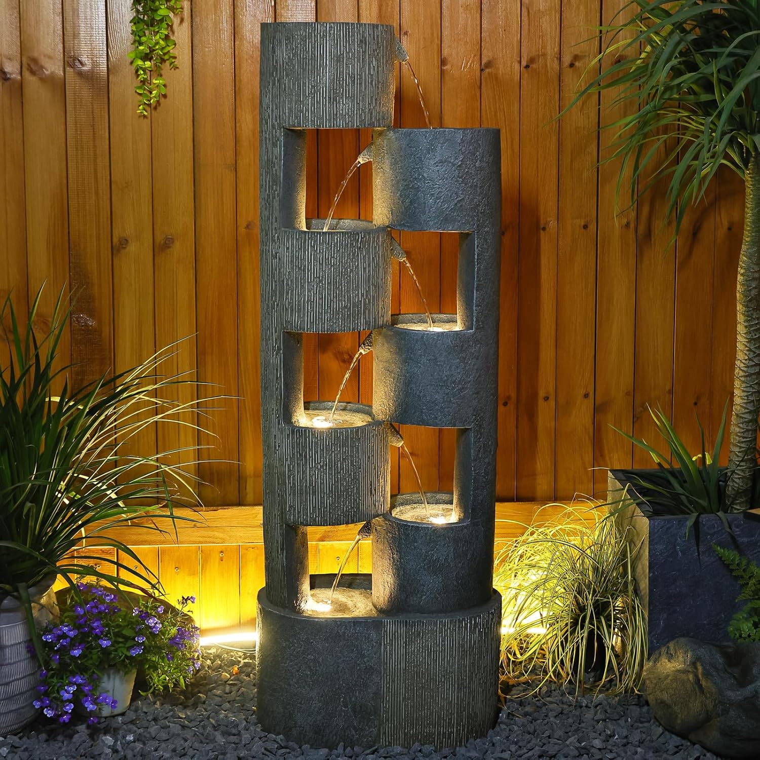 51" Outdoor Water Fountain Uneven Cylinders Waterfalls Fountain Floor Standing Water Fountains with LED Lights, Pump, Natural Stones for Garden, Living Room, Patio