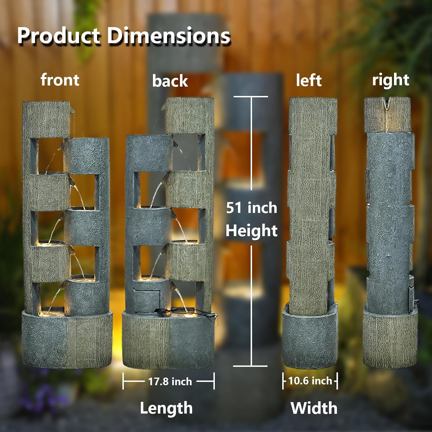 • OPTIMAL DIMENSIONS: Measuring 17.8" L * 10.6" W * 51" H, this fountain boasts the perfect size for both indoor and outdoor settings. Weighing 38.6lbs (17.5kg), when filled with water, it stands sturdy against any outdoor conditions, making it a resilient addition to your space.