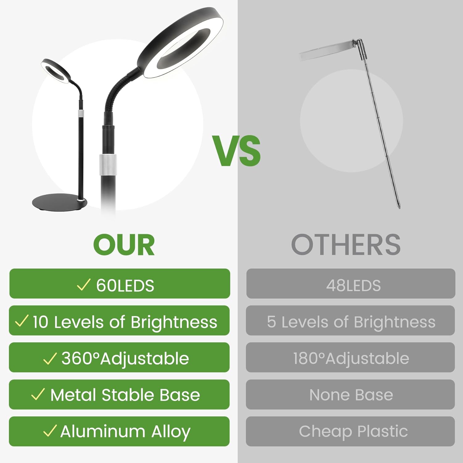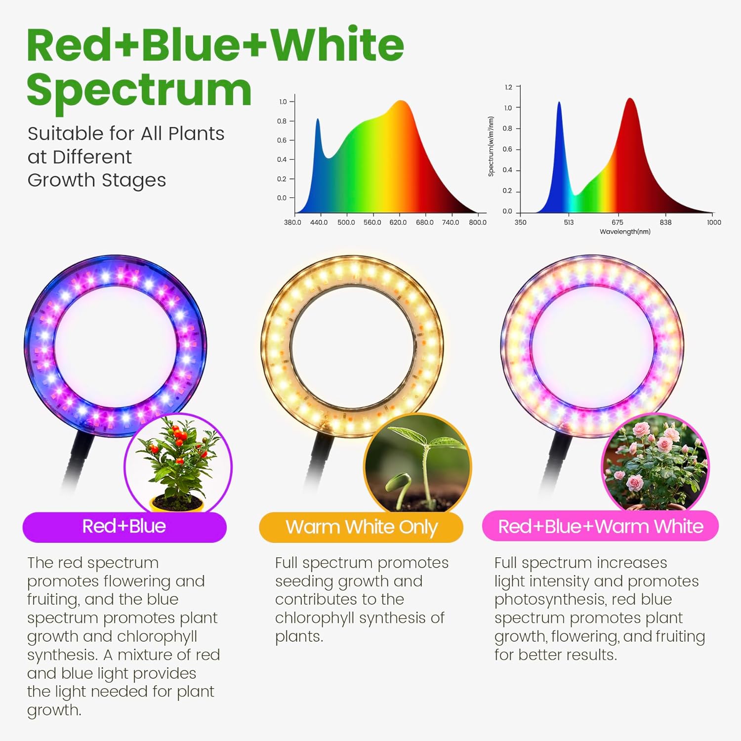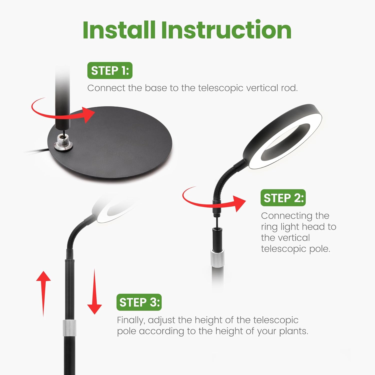 • Easy to Use & Height Adjustable: The halo grow light with an adjustable telescopic rod, you can easily adjust its height from 13.7" to 24.2", with a 360-degree flexible gooseneck, can adjust the angle and direction of the grow lamp to ensure that every part of the plant gets the best light it needs to grow. Plant lights for indoor growing are simple to use