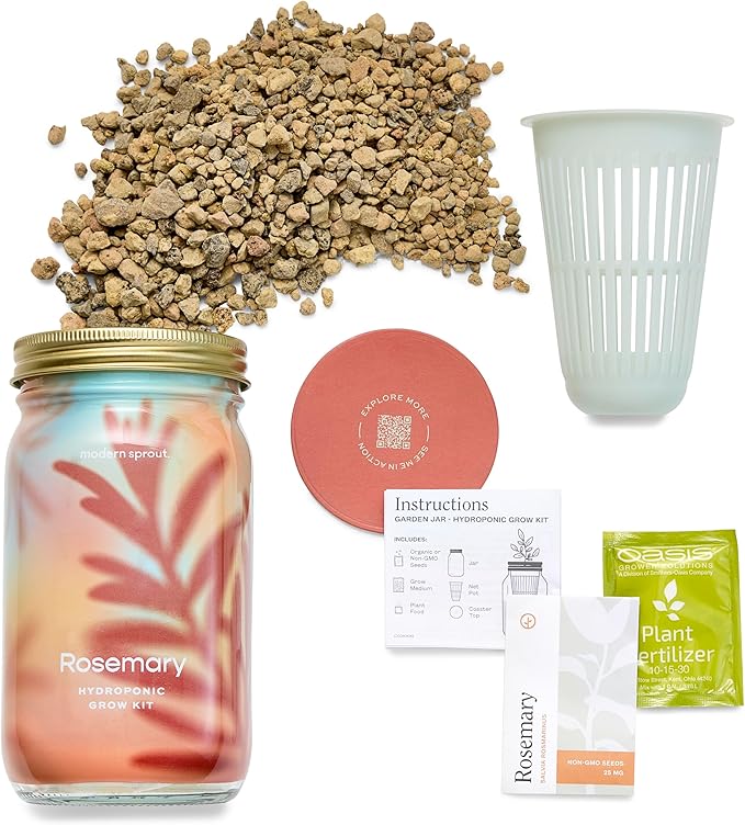 • Package Contents: 1 unit of hydroponic rosemary grow kit featuring a mason jar with a removable sleeve made from recyclable materials (6" high by 3.5" wide, weighing 1 lb), organic non-GMO rosemary seeds, a 100% recycled HDPE net pot made in the USA, lava rock grow medium sourced domestically, plant food, coaster, and detailed instructions; Designed for reuse and proudly assembled in the USA, it offers a sustainable way to grow fresh herbs indoors