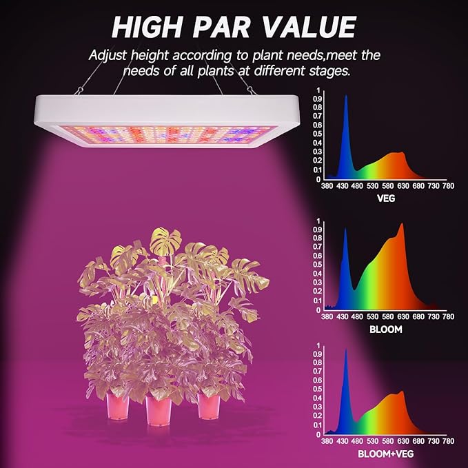 • 【Stage Adjustment】From now on, you don't have to worry about what type of plant grow light to choose for your plants. This super bright LED grow light has two switches: 'VEG' and 'BLOOM'. You can choose the most appropriate lighting mode according to the stage of plant growth,It can also provide timed lighting for plants, or turn on two switches to provide better growth conditions for plants