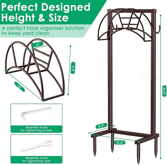 • 【EASY INSTALLATION】This hose holder arrived well-packaged and with clear, simple assembly instructions. All of the screws, bolts, nuts and tools needed for assembly were included plus a few spares. And it only takes 5-10 minutes to assemble.