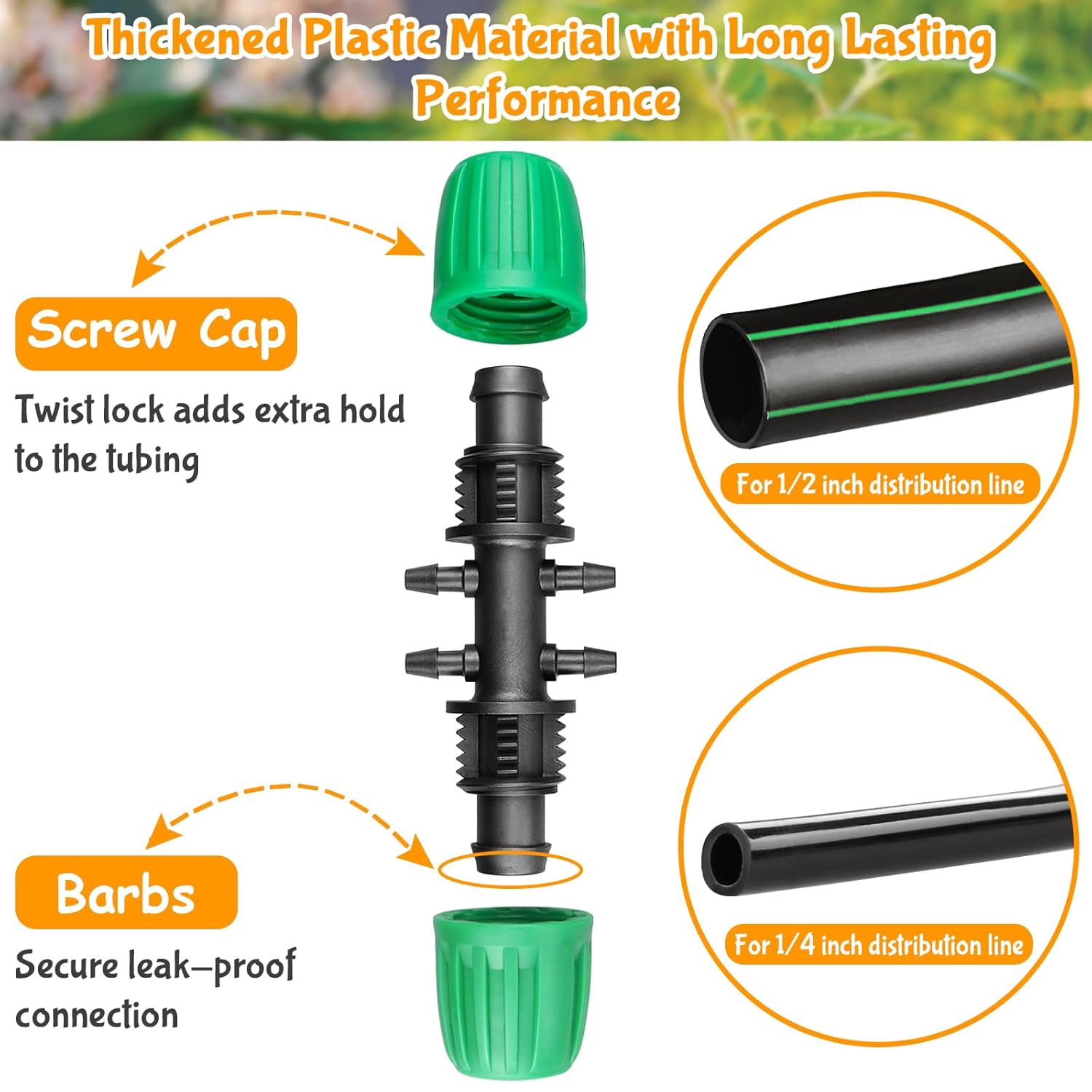 • EASY TO CONNECT: Simply push the tubing over the 1/2 and 1/4 barbed connector, the protruding barbed ends can grab drip irrigation tubing tightly for a secure leak-proof connection. Then tighten the threaded nut to fasten 1/2" tubing for double protection.