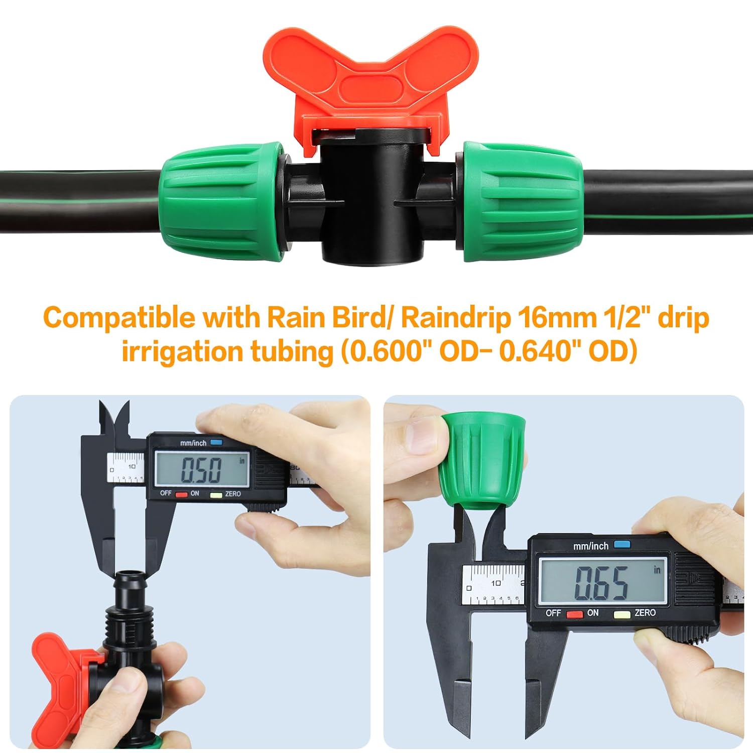 • FITS 1/2 INCH DRIP IRRIGATION TUBING (0.640" OD):These 1/2 inch drip irrigation shut off valves are compatible with Rain Bird / Raindrip 1/2" drip irrigation tubing (1/2" ID x 0.640" OD). (Please note there is no standard sizing for 1/2" drip irrigation tubing in US, so be sure to check the inside and outside diameter of your tubing to select the compatible irrigation fittings.)