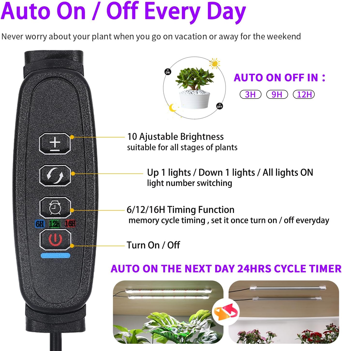 • 【Auto On/Off & Timing Function】The plant grow light comes with a cycle memory timer function, which can Auto turn on/off every day according to your settings: 6/12/16 hours, the grow light will Auto turn on and off at the same time the next day, no manual operation is required, it can take care of your plants when you on work or vacation.